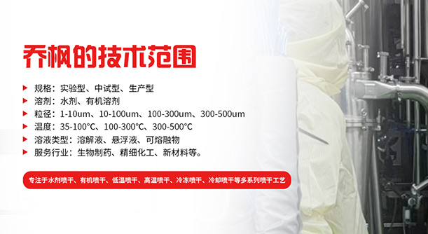 上海喬楓實業有限公司,成立于2012年,是從事噴霧干燥設備的研發設計、生產、銷售(小型噴霧干燥機實驗型噴霧干燥機,35℃低溫噴霧干燥機,有機溶劑噴霧干燥機,低溫閉式循環噴霧干燥機超細粉末噴霧干燥機、噴霧冷凍干燥機、真空噴霧干燥機、氣流噴霧干燥機,噴霧造粒干燥機離心噴霧干燥機,沸騰制粒機等)和售后于一體的綜合性公司,本公司現成為一家致力于為生物制藥、精細化工、新能源、陶瓷造粒及食品工程等領域提供全套解決方案的整線交鑰匙工程企業。